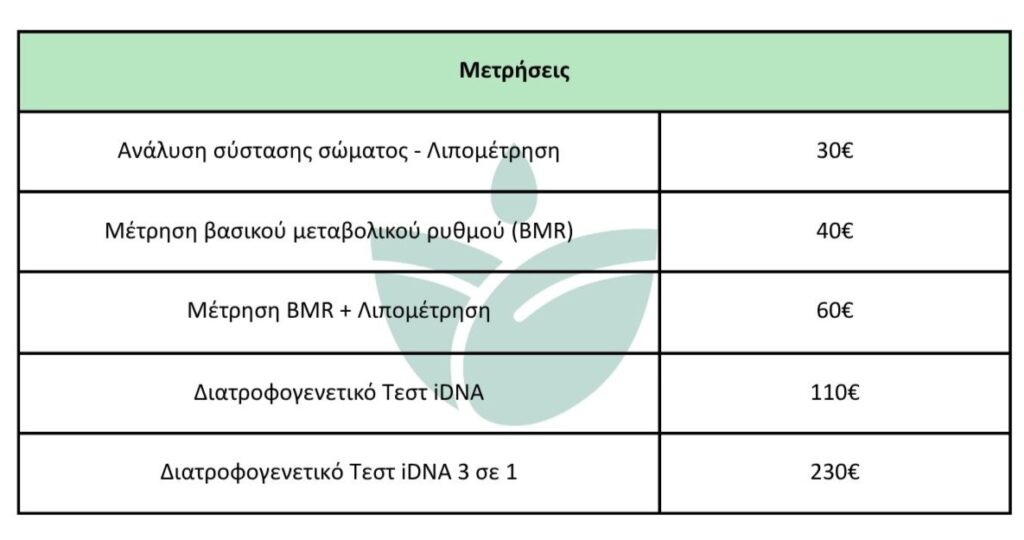 • Το κόστος για το Διατροφογενετικό Τεστ περιλαμβάνει τη λήψη δείγματος και τα αποτελέσματα. Σε περίπτωση που ενδιαφέρεστε για την επεξήγηση των αποτελεσμάτων απαιτεί επιπλέον συνεδρία (~40λεπτά) με επιπλέον κόστος 50€.